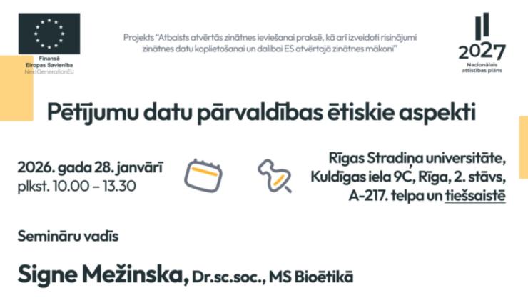 We invite everyone interested to participate in a seminar that will address the ethical aspects of research data management, including open data principles, research planning, informed consent, protection of participants' rights and of natural and cultural heritage, and ethical challenges in national and international research. The seminar will be led by Signe Mežinska (Dr.sc.soc., MS in bioethics).