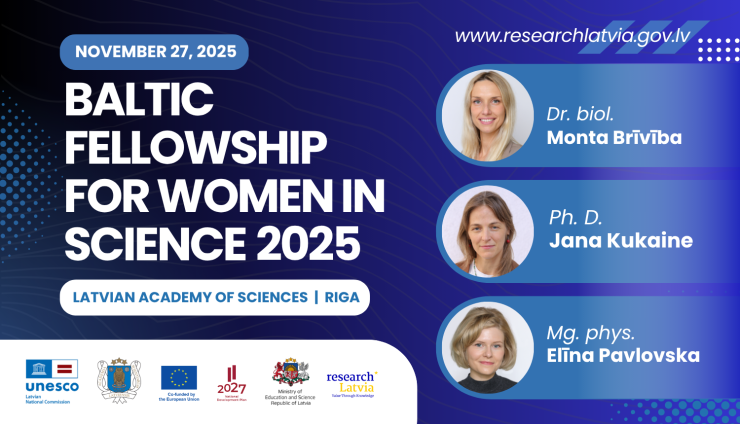 We invite you to follow an important event honoring the most distinguished female researchers in the Baltic region. On November 27, 2025, at 1:00 PM, the award ceremony "Women in Science Baltic Fellowship 2025" will take place in the Portrait Hall of the Latvian Academy of Sciences.