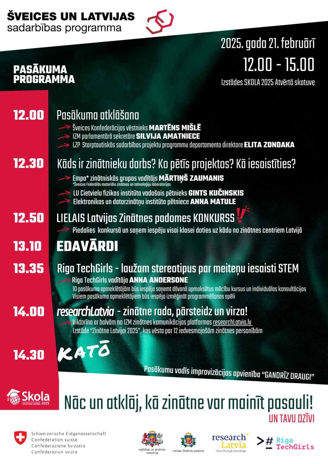 Starptautiskajā izglītības izstādē "Skola 2025" piektdien, 21. februārī, no plkst. 12.00 līdz 15.00 norisināsies Šveices – Latvijas sadarbības programmas "Lietišķā pētniecība" atklāšanas pasākums “NEIESPĒJAMAIS IR IESPĒJAMS”. Šis notikums pulcēs jauniešus, zinātniekus un inovāciju veidotājus, lai parādītu, kā zinātne var kļūt par katra jaunieša nākotnes iespēju.